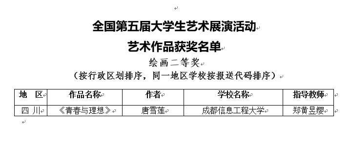 【本网讯】日前,全国第五届大学生艺术展演作品获奖结果揭晓,金年会文化艺术学院教师郑黄昱缨指导的视觉传达设计专业2015级学生唐雪莲作品《青春与理想》获得艺术作品绘画类二等奖,这是金年会在全国大学生艺术展演上首次获此殊荣。