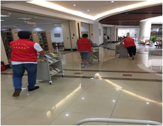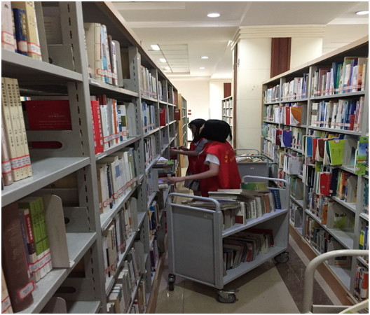毕业生党员身穿志愿者马甲,佩戴党员徽章,在进行简单的任务分配后,马上投身到志愿活动中。这次的志愿活动主要是为图书馆整理旧书,对旧书进行筛选、整理、下架等,方便后期新书的上架。毕业生党员王皓洁说:“我一直都非常喜欢图书馆这个地方,这里有浓郁的文化气息,我也见证了图书馆一天天变好,不管是图书馆的书籍也好,还是各种硬件设备,都越来越方便同学使用,我在图书馆收获的不仅仅是知识,更是一种享受,但是我能为图书馆做的却少之又少,这次能有机会在毕业之前为图书馆整理一次书籍,我真的非常荣幸。”